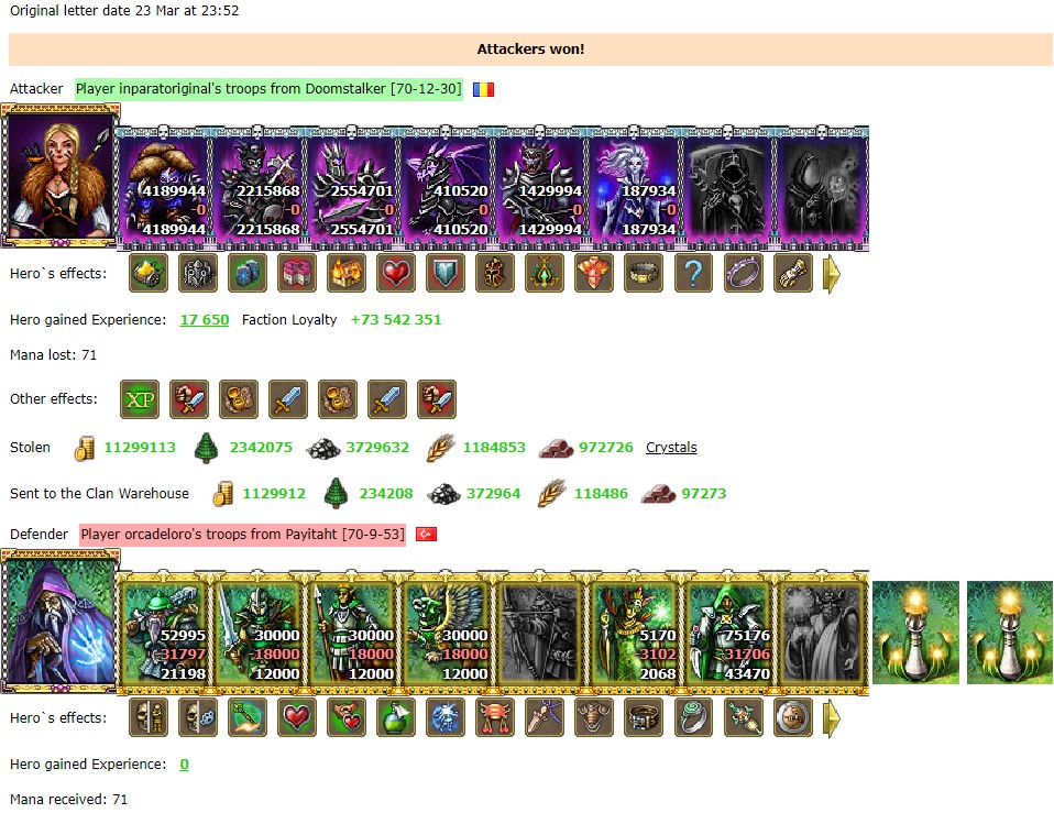 I think i understand you well, as a matter of fact i didn't said you cannot write on this post,all the contrary, i invited you to accommodate and post some of your great battles, as i see a player with a hero ranked in the great 6 position in the main rank i assume there are a lot of battles to see for gaining such position and since you are congratulating us i would like to exchange this and maybe learn from a top player as you ))toros5 wrote:This is game forum, not North Pole forum, and everyone is free to comment what they want, just to keep some rules, and I think I wrote exactly where I wanted and on topic - congratulated for battles after posts for battles... This is off topic now, but only to explain if someone didnt understand me...