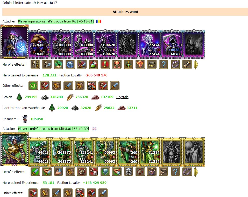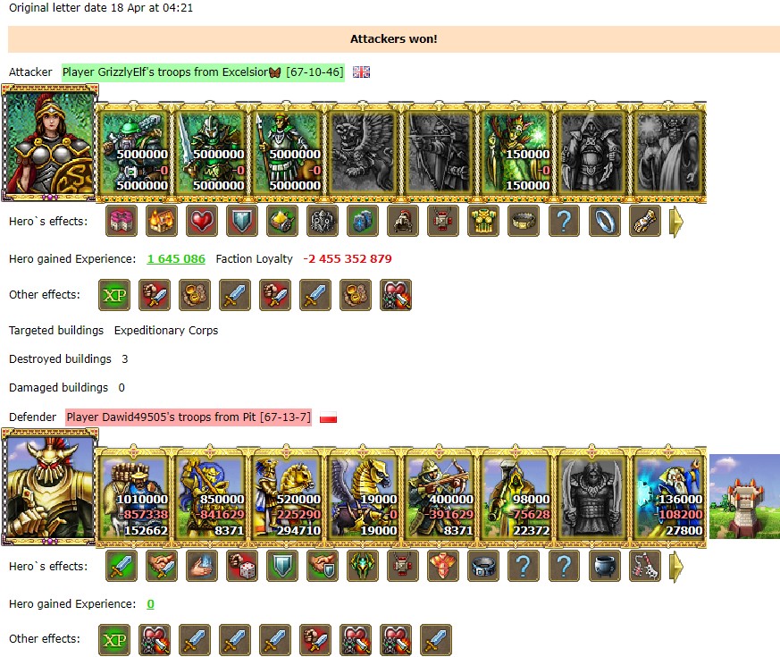 I think i understand you well, as a matter of fact i didn't said you cannot write on this post,all the contrary, i invited you to accommodate and post some of your great battles, as i see a player with a hero ranked in the great 6 position in the main rank i assume there are a lot of battles to see for gaining such position and since you are congratulating us i would like to exchange this and maybe learn from a top player as you ))toros5 wrote:This is game forum, not North Pole forum, and everyone is free to comment what they want, just to keep some rules, and I think I wrote exactly where I wanted and on topic - congratulated for battles after posts for battles... This is off topic now, but only to explain if someone didnt understand me...