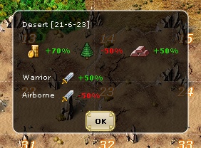 Each Square in Kingdom has its terrain. Each terrain has certain bonuses and penalties:- bonus on Resources Production