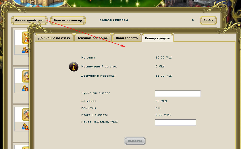 Далее выходите в окно выбора сервера, заходите в Финансовый счет, Вывод средств, и выводите сумму на WMZ кошелек. Выведенные средства зачисляются на wmz кошелек в течение 3 дней.